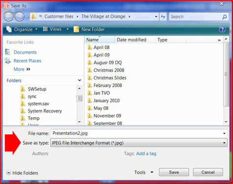 For 4:3 aspect ratio screens; set PowerPoint slide Width and Height under Page Setup to 22.68″ x 17.01″ (57.6 x 43.2 CM) for better quality. When your slide show is finished chose Save As; and select “Windows Media Player” if you are using Microsoft Powerpoint 2010; or “JPEG File Interchange Format (*.jpg)” if you are using other versions.